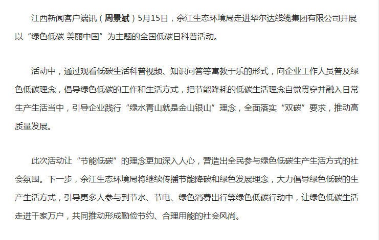 江西新闻客户端讯(周景斌)5月15日,余江生态环境局走进华尔达线缆集团有限公司开展以“绿色低碳 美丽中国”为主题的全国低碳日科普活动。活动中,通过观看低碳生活科...